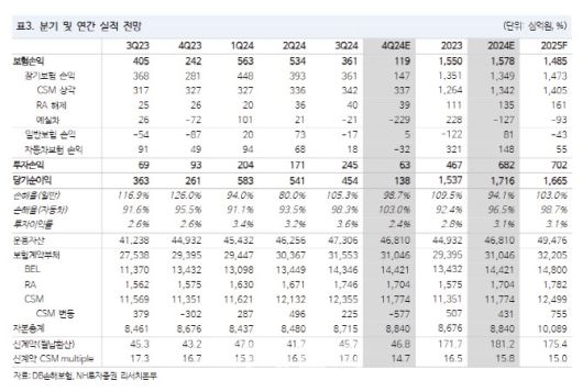 4분기 계절적 요인, 결산 계리적 가정 변경에 따라 손실계약비용 발생 및 보유 CSM이 감소할 것이란 전망이다. 절판 효과로 보장성 신계약은 비교적 견조할 것으로 봤다.