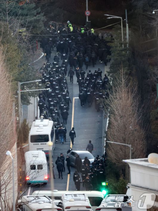 (서울=뉴스1) 오대일 기자 = 고위공직자범죄수사처와 경찰로 구성된 공조수사본부가 윤석열 대통령에 대한 2차 체포영장 집행에 돌입한 15일 오전 공수처 수사관들과 경찰 인력이 서울 용산구 한남동 대통령 관저 정문을 통과해 이동하고 있다. 2025.1.15/뉴스1