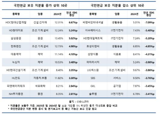 국민연금이 지난해 지분율을 가장 많이 늘린 종목은 HDC현대산업개발(294870)이었다. 국민연금이 보유한 HDC현대산업개발 지분율은 2023년 말 5.64%에서 2024년 말 12.31%로 6.67%포인트 증가했다. 2위는 HD현대미포(010620)로, 같은 기간 국민연금 보유 지분율이 7.00%에서 12.24%로 5.24%포인트 늘었다. 3위는 5.02%포인트 증가한 삼성증권(016360)(8.43%→13.45%)으로 나타났다.