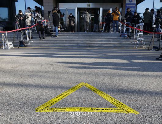 윤석열 대통령 2차 체포영장 집행이 실시된 15일 경기 과천시 정부과천청사 내 고위공직자범죄수사처 앞에 윤 대통령이 설 포토라인이 설치돼 있다. 문재원 기자 |