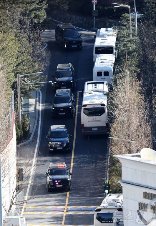 (서울=뉴스1) 오대일 기자 = 내란 우두머리 혐의로 체포된 윤석열 대통령을 태운 차량 행렬이 15일 오전 서울 용산구 한남동 대통령 관저를 빠져나와 과천 공수처 조사실로 향하고 있다. 2025.1.15/뉴스1