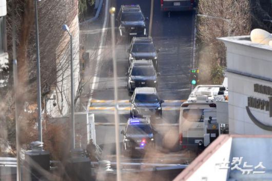 고위공직자범죄수사처와 경찰에 의해 체포된 윤석열 대통령이 탑승한 차량이 15일 오전 서울 용산구 한남동 윤석열 대통령 관저를 나서고 있다.저작권자 © CBS 노컷뉴스 무단전재 및 재배포 금지