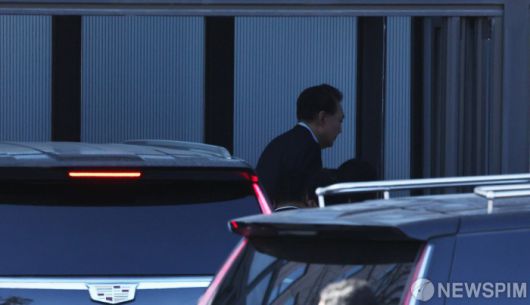 [과천=뉴스핌] 김학선 기자 = 내란 우두머리 등의 혐의로 체포된 윤석열 대통령이 15일 경기도 정부과천청사 공수처로 도착하고 있다. 2025.01.15 yooksa@newspim.com