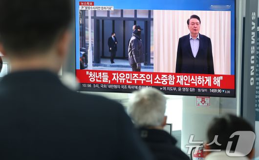 (광주=뉴스1) 김태성 기자 = 윤석열 대통령이 내란 우두머리 혐의로 체포된 15일 오전 광주 송정역에서 시민들이 윤 대통령의 담화를 시청하고 있다. 2025.1.15/뉴스1