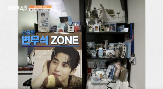 이뿐 아니라 ‘우석존(ZONE)’도 있었다. 남편은 “우석존이 화장대부터 시작됐다. 화장대가 좁다고 책장에 책을 다 꺼내고 변우석 굿즈로 다 채워넣었다”며 “중고거래를 하는데 차가 필요하다고 해서 가져가더니 190cm 변우석 등신대를 가져왔다”고 사진도 공개했다.