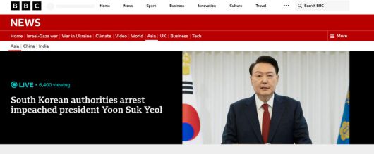 영국 비비시(BBC)는 내란죄로 조사받고 있는 윤석열 대통령이 한국 역사상 처음으로 현직 대통령 신분으로 체포됐다고 실시간으로 보도했다. 에이피(AP)통신도 “수백명의 수사관과 경찰이 윤대통령을 체포하기 위해 대통령 관저에 도착한 지 수시간 만에 탄핵된 대통령을 체포, 구금했다”고 보도했다.