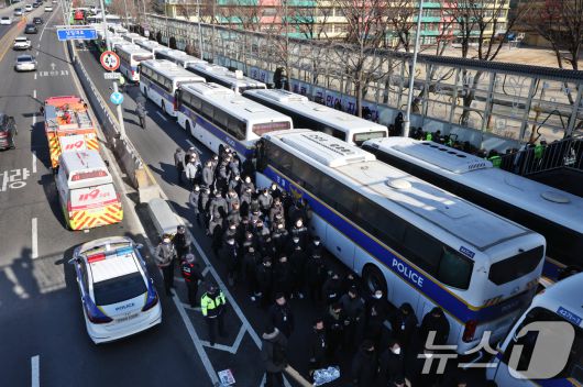 (서울=뉴스1) 송원영 기자 = 고위공직자범죄수사처가 내란 우두머리 등 혐의를 받는 윤석열 대통령을 체포한 15일 서울 용산구 대통령 관저 앞의 경찰들이 이동하고 있다. 2025.1.15/뉴스1