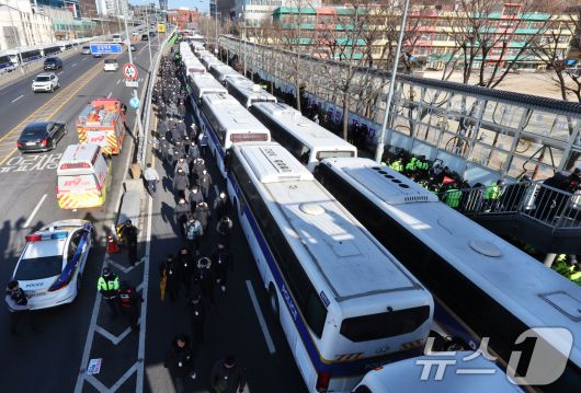 (서울=뉴스1) 송원영 기자 = 고위공직자범죄수사처가 내란 우두머리 등 혐의를 받는 윤석열 대통령을 체포한 15일 서울 용산구 대통령 관저 앞의 경찰들이 이동하고 있다. 2025.1.15/뉴스1sowon@news1.krCopyright ⓒ 뉴스1. All rights reserved. 무단 전재 및 재배포, AI학습 이용 금지.