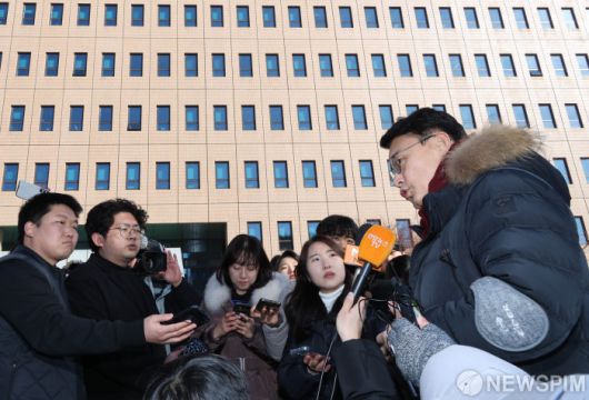 [과천=뉴스핌] 김학선 기자 = 내란 우두머리 등의 혐의로 체포된 윤석열 대통령이 15일 경기도 정부과천청사 공수처로 이송돼 조사를 받는 가운데 윤상현 국민의힘 의원이 취재진의 질문에 답하고 있다. 2025.01.15 yooksa@newspim.com