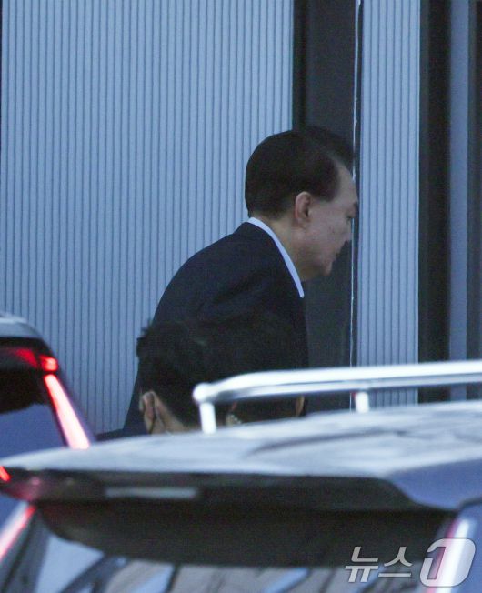 (과천=뉴스1) 김영운 기자 = 내란 우두머리 혐의로 체포된 윤석열 대통령이 15일 오전 경기 과천 고위공직자범죄수사처(공수처)에 도착해 조사실로 향하고 있다. (공동취재) 2025.1.15/뉴스1photo@news1.krCopyright ⓒ 뉴스1. All rights reserved. 무단 전재 및 재배포, AI학습 이용 금지.