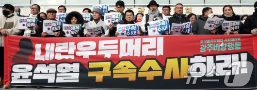 (광주=뉴스1) 이수민 기자 = 광주 지역 시민사회단체로 구성된 광주비상행동이 15일 광주시의회 정문 앞에서 '내란 우두머리 윤석열 구속수사' 기자회견을 개최하고 있다. 2025.1.15/뉴스1