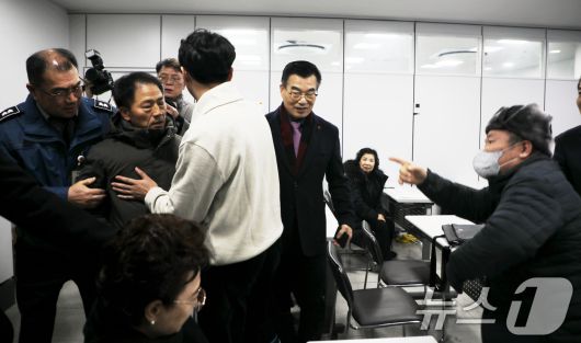 윤석열 대통령이 '12·3 계엄 사태' 이후 43일 만에 체포된 15일 광주시의회 브리핑룸에서 자유민주주의 수호 광주연대가 '탄핵 반대' 기자회견을 개최한 가운데 '탄핵 찬성'을 주장하고 있는 광주비상행동과 충돌하고 있다. 2025.1.15/뉴스1 ⓒ News1 이수민 기자 |