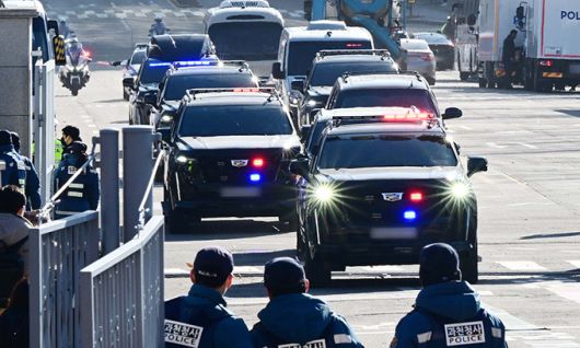 윤석열 대통령이 탄 차량 행렬이 15일 경기 과천시 정부과천청사 내 고위공직자범죄수사처로 향하고 있다. 공동취재사진 |