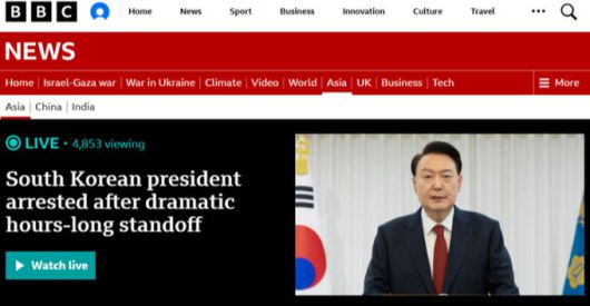 윤석열 대통령이 내란 수괴 등 혐의로 체포된 데 대해 외신들도 15일 새벽부터 영장 집행 과정 및 체포 이후의 상황을 주요 뉴스로 다루며 긴급 타전했다.
