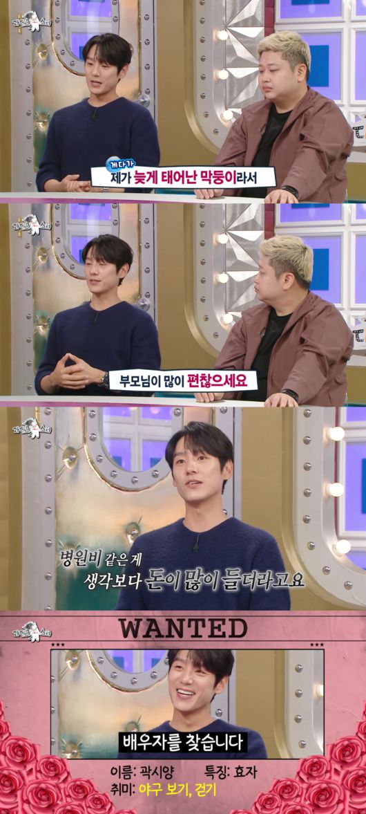 곽시양은 “늦둥이이고, 막둥이여서, 부모님께서 이제는 편찮으시더라. 병원비가 많이 나오더라”라며 현실적인 이유를 말했다.
