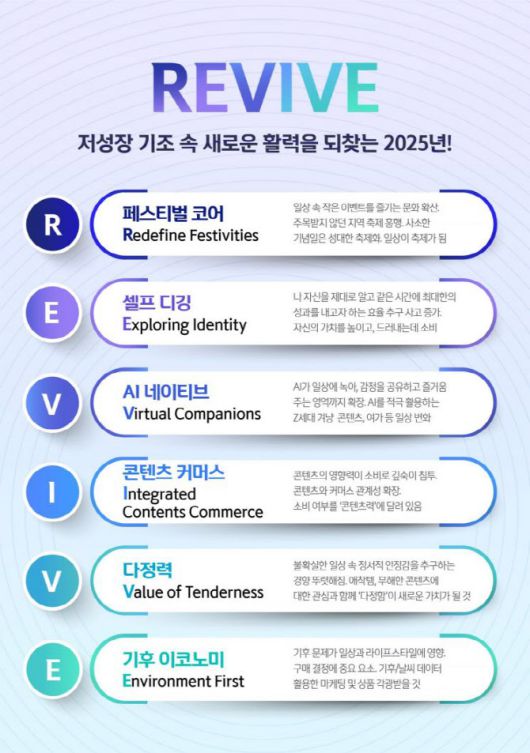 신한카드 빅데이터연구소는 R.E.V.I.V.E의 세부 키워드로 ‘페스티벌 코어(Redefine Festivities), 셀프 디깅(Exploring Identity), AI 네이티브(Virtual Companions), 콘텐츠 커머스(Integrated Contents Commerce), 다정력(Value of Tenderness), 기후 이코노미(Environment First)를 전망했다.
