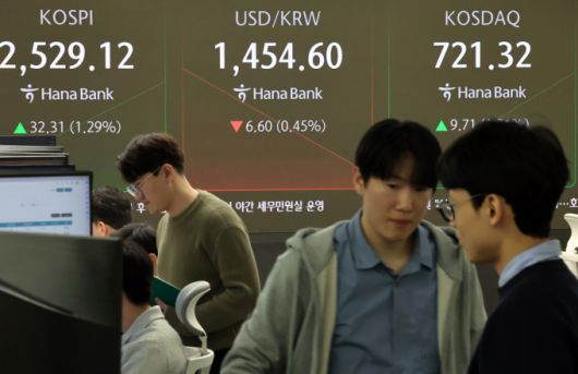 16일 오전 서울 중구 하나은행 본점 딜링룸 전광판에 증시가 표시되고 있다. 이날 코스피 지수는 전 거래일 대비 32.31p(1.29%) 오른 2,529.12, 코스닥 지수는 9.71p(1.36%) 오른 721.32, 달러·원 환율은 6.60원 내린 1,454.60원을 보이고 있다. 2025.1.16/뉴스1 /사진=(서울=뉴스1) 박정호 기자 |