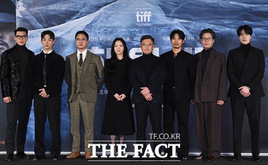 배우 현빈과 박정민, 조우진, 전여빈, 우민호 감독, 배우 박훈, 유재명, 이동욱(왼쪽부터)이 호흡을 맞춘 '하얼빈'이 23일 연속 박스오피스 1위를 기록 중이다. /서예원 기자 |