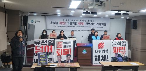 (원주=연합뉴스) 임보연 기자 = 윤석열정권퇴진 원주운동본부는 16일 내란수괴 윤석열 구속·파면과 국민의힘 해산을 촉구하고 앞으로 활동 방향을 밝혔다.