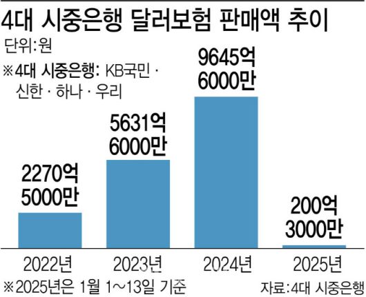 16일 금융권에 따르면 지난 1일부터 13일까지 4대 시중은행(KB국민·신한·하나·우리)의 달러 보험 판매액은 200억 6000만원으로 집계됐다. 원·달러 환율이 1300원대 초반이던 지난해 1월엔 판매액이 300억원 수준이었는데 올해는 2주 만에 200억이 몰렸다.