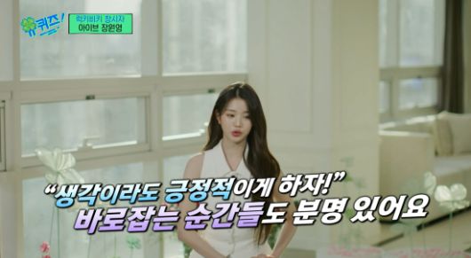 장원영은 "사람의 생각과 말에도 에너지가 있다고 믿어서 불안과 부정적인 생각이 피어오른다면 '생각이라도 긍정적이게 하자'고 바로잡는 순간들도 있는 것 같다"며 "낙천적으로 보일 수 있는 이 사고방식으로 살다가 옳지 않은 길로 갔으면 이 사고를 관뒀을 텐데, 옳은 길로 결국엔 갔고 지금 제가 와있는 길이나 위치를 봐도 잘못되지 않은 것 같아서 기쁜 마음으로 계속 (원영적 사고를) 생각해나갈 수 있는 것 같다"고 말했다.
