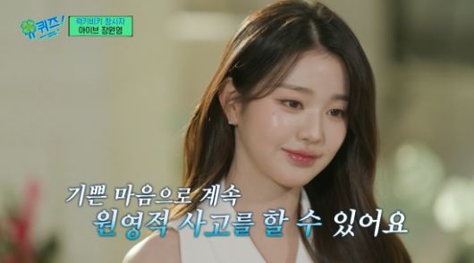 유재석은 장원영에게 "'원영적 사고'라고 불리는 긍정적 마인드는 언제부터 가지게 됐냐"고 물었다. 이에 장원영은 "어렸을 떄부터 이렇게 살아온 것 같다"면서 "낙천적이라고 할 수 있는데, 나쁜 일이 있을 때 나쁜 상황에 초점을 맞춘다기 보다는 나쁜 일 이후의 일들을 생각했던 것 같고, 나쁜 일에 고립된 적은 없던 것 같다"고 말하며 '초긍정' 사고의 비결을 설명했다.