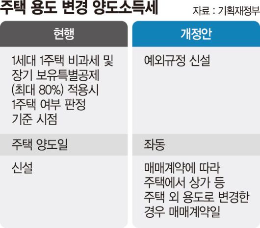특히 주택을 상가로 바꿔 파는 경우 양도세 기준을 실거래 관행에 맞게 바꿨다. 기존에는 1세대1주택 비과세 및 장기보유특별공제(최대 80%) 적용 시 1주택 여부 판정 기준 시점은 '주택 양도일'이었다. 따라서 매도자가 양도세 혜택을 보기 위해선 주택 잔금 치르는 날 파는 물건이 주택이어야 했다. 이번 개정안은 예외규정을 신설했다. 주택에서 상가 등 주택 외 용도로 변경한 경우 양도세 기준 시점을 '매매계약일'로 바꿨다. 양도일이 아닌 계약일에 주택이면 1주택자 양도세 혜택을 보는 셈이다.