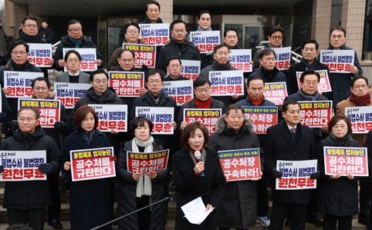 국민의힘 의원 30여명은 이날 오후 과천에 있는 공수처 청사를 찾아 '사법체계 파괴하는 공수처는 해체하라' 등의 구호를 외치며 항의 집회를 열었다.