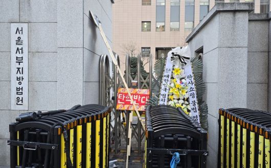윤석열 대통령의 체포적부심 청구가 기각된 다음 날인 17일 오전 서울서부지법 앞에 ‘탄핵 반대’ 손팻말과 근조화환 등이 놓여 있다. 김가윤 기자 |