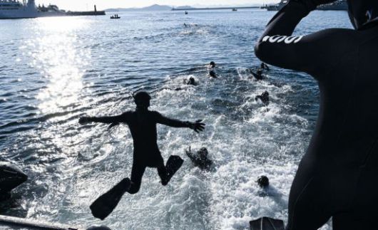 훈련 3일차인 16일 철인중대 선발경기의 한 종목인 오리발 수영에서 심해 잠수사(SSU)들이 겨울 바다로 뛰어들고 있다. (사진제공=해군) |