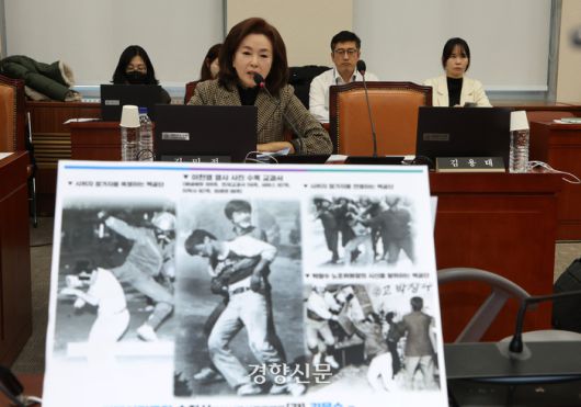 김문수 민주당 의원은 이한열 열사가 최루탄을 맞고 피를 흘리는 사진을 들며 “이한열 열사의 희생 뒤에는 최루탄만 있었던 것이 아니고 민주주의를 짓밟았던 폭력조직 백골단이 있었다. 백골단이라는 이름이 오늘날 국회 교육위원회 위원인 김민전 의원의 기자회견장에 소환됐다”고 말했다. 그러면서 “교육위는 김 의원님 같은 분이 계실 자리는 아니다”라고 말했다.