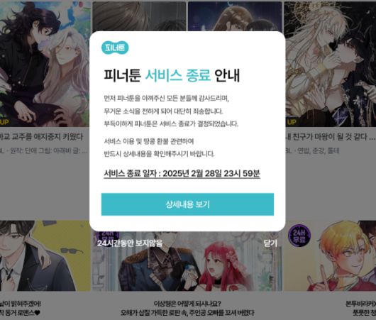 피너툰은 17일 홈페이지와 공식 엑스(X·옛 트위터)에 공지를 올려 "오는 2월 28일부로 서비스를 종료하기로 결정했다"며 "서비스 이용 및 '땅콩' 환불 관련해서는 홈페이지 상세 내용을 확인해달라"고 밝혔다.
