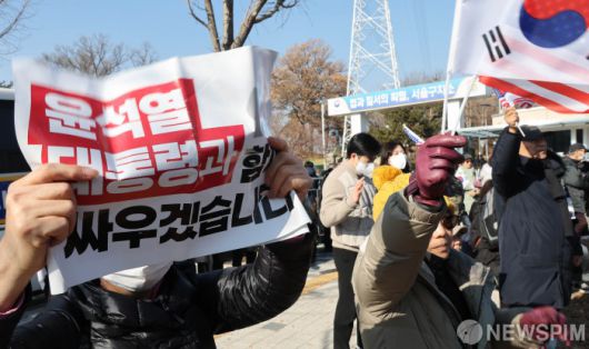 [의왕=뉴스핌] 김학선 기자 = 17일 오후 내란 우두머리 혐의로 체포된 윤석열 대통령이 구금된 경기도 의왕시 서울구치소 앞에서 윤 대통령 지지자들이 응원 집회를 하고 있다. 2025.01.17 yooksa@newspim.com