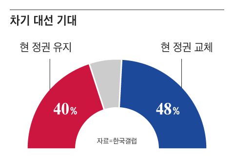 17일 발표된 한국갤럽 여론조사에서도 국민의힘 지지도(39%)가 더불어민주당 지지도(36%)를 3%포인트 앞선 것으로 나타났다. 오차 범위 안(±3.1%p)이지만, 양당 지지율이 동률(각 32%)을 기록한 작년 10월 다섯째 주 조사 이후 두 달 반 만에 국민의힘 지지도가 민주당을 역전한 것이다. 지난 16일 발표된 엠브레인퍼블릭·케이스탯리서치·코리아리서치·한국리서치 4사의 공동 전국지표조사(NBS)에서 국민의힘(35%) 지지도가 민주당(33%)을 다시 앞선 데 이어 갤럽 조사에서도 이런 추세가 이어진 것이다.