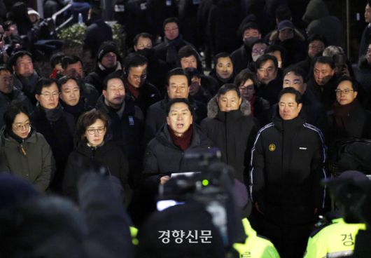 김기현 전 대표를 비롯한 국민의힘 의원들이 지난 1월 15일 서울 용산구 한남동 대통령 관저 앞에 집결해 윤석열 대통령 체포영장 집행에 관한 입장을 발표하고 있다. 권도현 기자 |