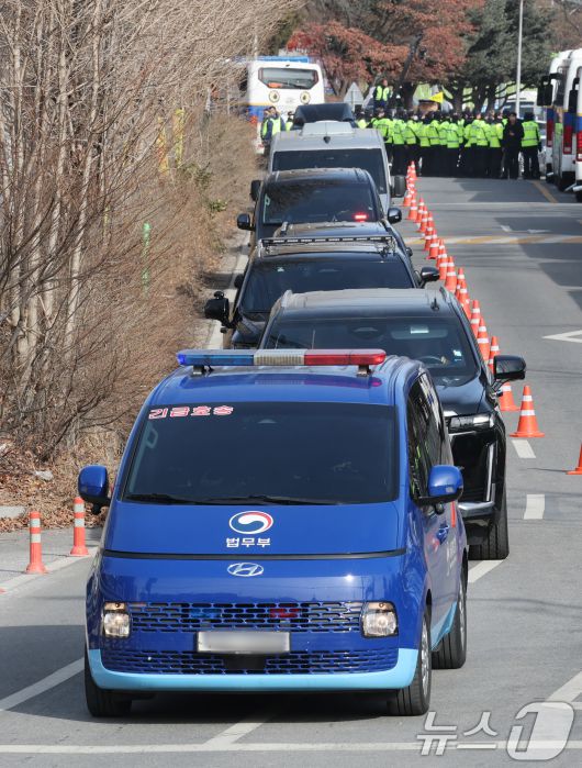 (의왕=뉴스1) 박세연 기자 = 윤석열 대통령을 태운 호송차량이 18일 서울 서부지방법원에서 열리는 내란 우두머리 혐의 구속 영장실질심사에 출석하기 위해 경기도 의왕시 서울구치소를 나서고 있다. 2025.1.18/뉴스1