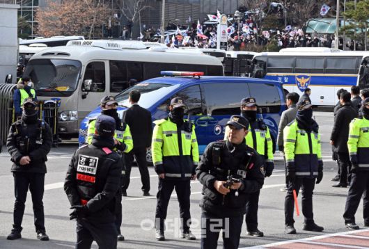 [이데일리 노진환 기자] 내란 수괴 혐의로 체포된 윤석열 대통령의 구속 전 피의자심문(영장실질심사)을 앞두고 윤 대통령이 탄 것으로 추정되는 법무부 호송차량이 18일 서울 마포구 서울서부지법에 도착하고 있다.
