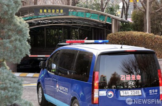 [서울=뉴스핌] 김학선 기자 = 내란 우두머리 혐의로 체포된 윤석열 대통령의 구속 전 피의자심문(영장실질심사)을 앞두고 윤 대통령이 탄 것으로 추정되는 법무부 호송차량이 18일 서울 마포구 서울서부지법에 도착하고 있다. 2025.01.18 yooksa@newspim.com