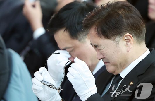 (무안=뉴스1) 김진환 기자 = 최상목 대통령 권한대행 부총리 겸 기획재정부 장관과 우원식 국회의장이 18일 오전 전남 무안국제공항에서 열린 12·29 제주항공 여객기 참사 희생자 합동 추모식에 참석해 눈물을 닦고 있다. 2025.1.18/뉴스1kwangshinQQ@news1.krCopyright ⓒ 뉴스1. All rights reserved. 무단 전재 및 재배포, AI학습 이용 금지.