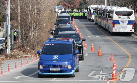 내란 우두머리 혐의로 체포된 윤석열 대통령이 탑승한 차량 행렬이 18일 경기도 의왕시 서울구치소에서 나와 구속 전 피의자심문(영장실질심사)이 열리는 서울서부지법으로 향하고 있다. (공동취재)2025.1.18/뉴스1 ⓒ News1 박세연 기자 |