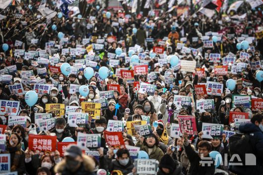 [서울=뉴시스]정병혁 기자 = 윤석열 대통령에 대한 영장실질심사(구속 전 피의자 심문)이 열린 18일 서울 종로구 동십자각 앞에서 윤석열 즉각 퇴진 사회대개혁, 범시민대행진이 열렸다.