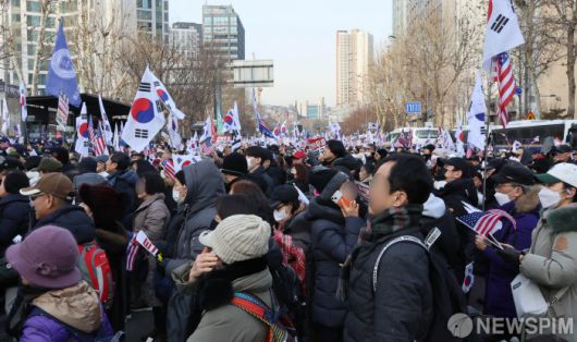 [서울=뉴스핌] 양윤모 기자 = 12·3 비상계엄 선포로 '내란 수괴(우두머리)' 혐의로 고위공직자범죄수사처에 체포된 윤석열 대통령이 18일 오후 2시 서울서부지방법원에서 열리는 구속 전 피의자 심문(영장실질심사)에 출석한 가운데, 윤 대통령의 구속을 반대하는 지지자들이 법원 앞 도로에서 집회를 하고 있다. 2025.01.18 yym58@newspim.com