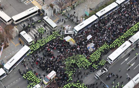 내란 우두머리 혐의로 체포된 윤석열 대통령이 출석한 가운데 구속 전 피의자심문(영장실질심사)이 열린 18일 서울 마포구 서울서부지법 앞 마포대로에서 윤 대통령 지지자들과 보수단체 회원들이 윤 대통령 석방을 촉구하며 시위하고 있다. 공동취재사진 |