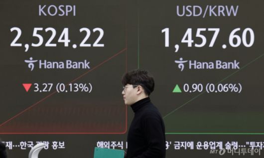 코스피가 전 거래일보다 6.64포인트(0.26%) 하락한 2520.85로 장을 시작한 17일 서울 중구 하나은행 딜링룸에서 딜러들이 업무를 보고 있다. /사진=뉴시스 |