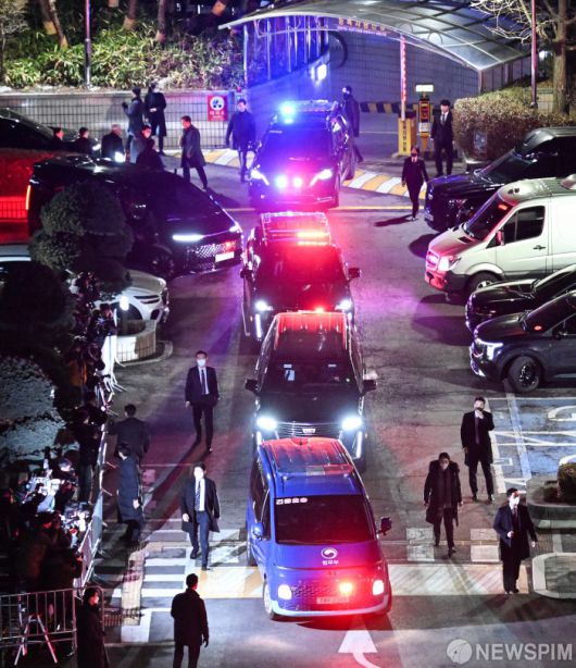 [서울=뉴스핌] 김학선 기자 = 18일 오후 서울 마포구 서울서부지방법원에서 내란 우두머리 혐의로 체포된 윤석열 대통령이 영장실질심사를 마친 뒤 호송차를 타고 서부지법을 빠져나가고 있다. 2025.01.18 yooksa@newspim.com