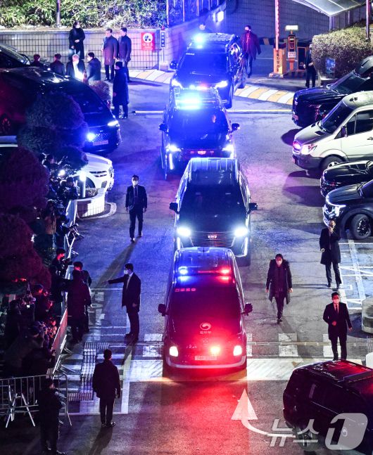 (서울=뉴스1) 민경석 기자 = 내란 우두머리 혐의로 체포된 윤석열 대통령이 18일 오후 서울 마포구 서울서부지방법원에서 영장실질심사를 받았다. 윤 대통령에 대한 영장심사가 끝난 뒤 호송차량을 비롯한 경호차량들이 법원을 빠져나가고 있다.(공동취재) 2025.1.18/뉴스1