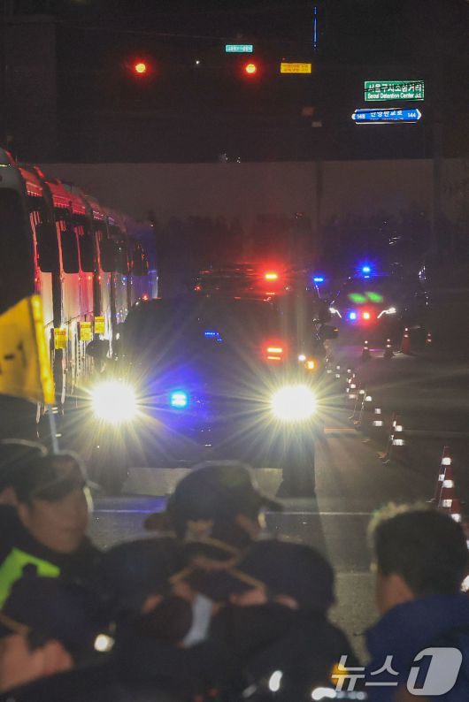 (의왕=뉴스1) 박세연 기자 = 서울서부지방법원에서 열린 영장실질심사를 마친 윤석열 대통령이 탑승한 호송차량이 18일 오후 경기도 의왕시 서울구치소로 들어서고 있다. (공동취재)2025.1.18/뉴스1
