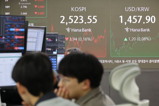 17일 오후 서울 중구 하나은행 본점 딜링룸 현황판에 코스피 지수 등이 표시되고 있다. /연합뉴스 |