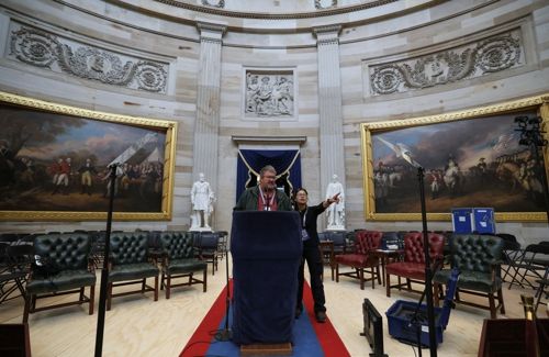 18일(현지시간) 미국 워싱턴DC 국회의사당의 도널드 트럼프 대통령 취임식이 열리는 로툰다홀에서 직원들이 준비에 여념이 없다. 워싱턴DC 로이터 연합뉴스
