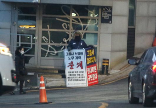 현대제철 노동조합원이 지난 15일 오전 서울 용산구 한남동 정의선 현대차그룹 회장 자택 인근에서 성과급 지급 등을 요구하는 피켓 시위를 벌이고 있다.(사진=연합뉴스) |
